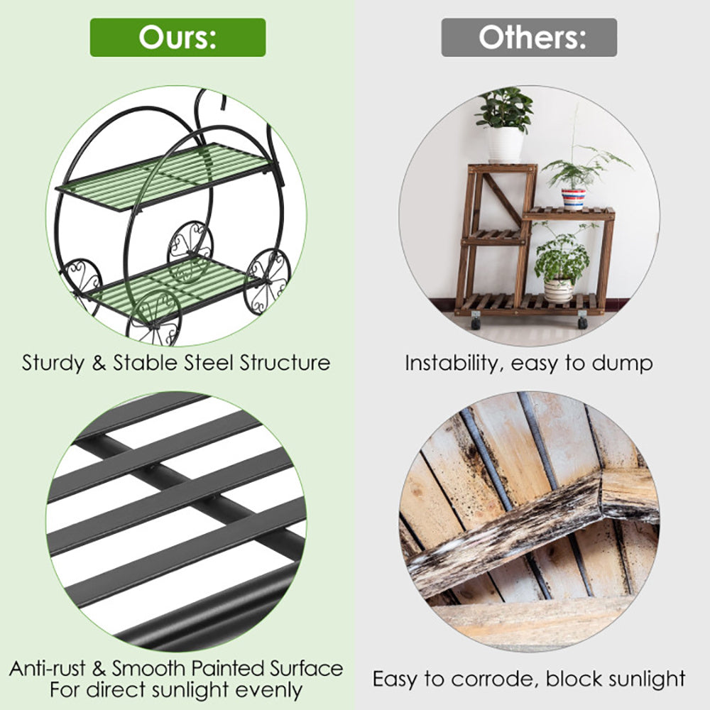 Its shape looks like a Parisian trolley cart with round wheels. It can perfectly serve as a exquisite and classic decoration. There are two tiers in total and each tier is wide enough for you can put your plant pot or flowers on.